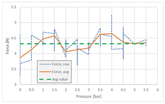 Testing the forces without friction lining tape on the gripper clamps confirmed the inability of the system to hold the pipette—with an average value of FZ = 4.3 N; the results are presented in Figure 12. The measuring method is the same (n = 5 samples), but the pressure intervals were set at 0.5 bar.