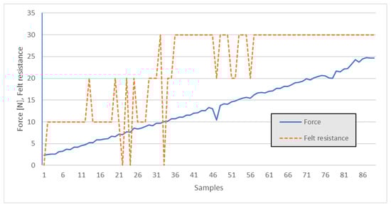 From the figure’s data, one can observe that under 10 N, attachment failure relative to the tips was likely, i.e., where “Felt resistance” falls to zero. Thus, further experiments should concentrate on push-fit forces above 10 N.