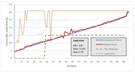 The measured force was also recorded. The results are presented in Figure 14 and Table 3. The outcome referred to the gripper still being attached (Figure 14—graph value 15) or unattached (Figure 14—graph value 0), and it referred to the time (s) until the tip started leaking. It can be observed that when the pushing force FZ is >15 N, there is no leak in the first 30 s.