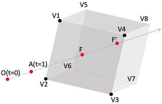 Figure 3. An illustration of the implementation of the Möller–Trumbore ray-triangle intersection algorithm for collision detection. The ray, shown as a blue arrow line, intersects with the face  V 1 - V 2 - V 3 - V 4  at point F and the face  V 5 - V 6 - V 7 - V 8  at point  F . Since points F and  F ’s intersection times are not within the interval  [ 0 , 1 ] , the segment  O A  does not collide with the bounding box.