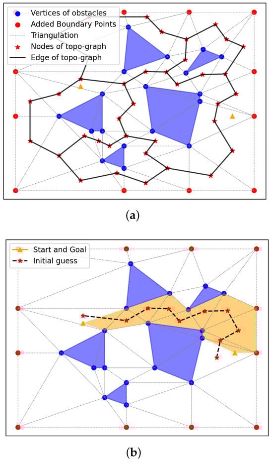 Figure 4. An example of the generated flight corridor in 2D. In Panel (a), the blue polygons are the obstacles, the blue dots are the obstacle vertices, and the red dots are the virtual vertices, which are sampled from the boundary of the detection range described in Section 5.1. The constructed topo-graph nodes are marked as red stars, and edges are black solid lines. In Panel (b), the triangles containing the start and goal are located, and by applying Dijkstra method to the constructed topo-graph, the initial path is obtained (red stars and black dashed lines). The triangles that the path goes through constitute the flight corridor (shaded in orange).
