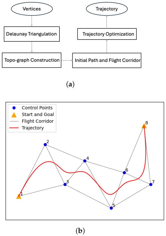Our flight corridor generation method is inspired by [24], where collision-free segments connecting vertices of obstacles are created, and [25], where Delaunay triangulation is used to divide the space into non-overlapping partitions, i.e., triangles in 2D and tetrahedrons in 3D. Using the space partitioning obtained via Delaunay triangulation, the proposed method constructs a topo-graph  G = ( U , E ) , where node U represents the center of each collision-free partition and edge E represents the segment connecting the centers of neighboring free partitions. This topo-graph is a topological description of the free space and the basis for finding a path  { U i }  that defines a flight corridor as the union of the partitions corresponding to each one of the nodes that make up the path (Figure 4).