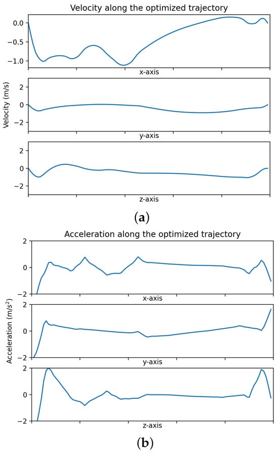 In Table 1, a comparison between the trajectory generated by the optimized control points and the initial control points is illustrated. It shows that the optimized trajectory has a higher average velocity with a smaller length and shorter time. Furthermore, the velocities and accelerations along a generated trajectory from  [ 9.5 , 9.5 , 9.5 ] T  to  [ 1 , 1 , 1 ] T  with given velocity  [ 0 , 0 , 0 ] T  (the simulated UAV is initially still) are illustrated in Figure 6a,b. It can be observed that the velocity and acceleration are constrained within their maximum values  [ 3 , 3 ]  m/s and  [ 2 , 2 ]  m/s2 and change smoothly.