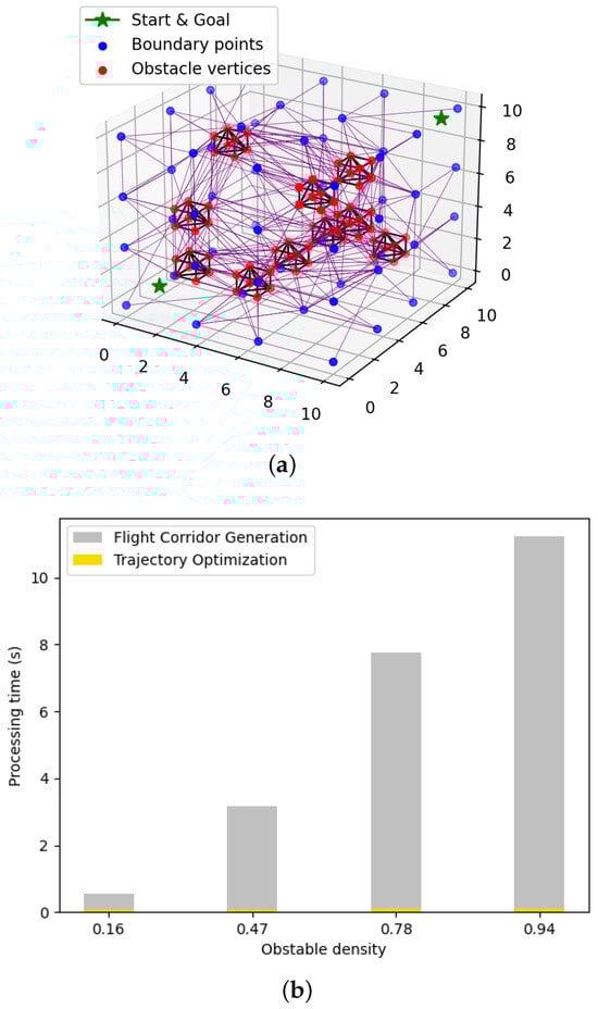 Figure 7. (a) Constructed flight corridor. The blue dots are the added virtual vertices. The red dots together with the black solid lines represent the obstacles. The partitions of the free space using Delaunay triangulation are shown with purple solid lines. (b) Comparison between the processing time of the flight corridor generation method (in grey) and trajectory optimization method (in yellow) under different obstacle densities.