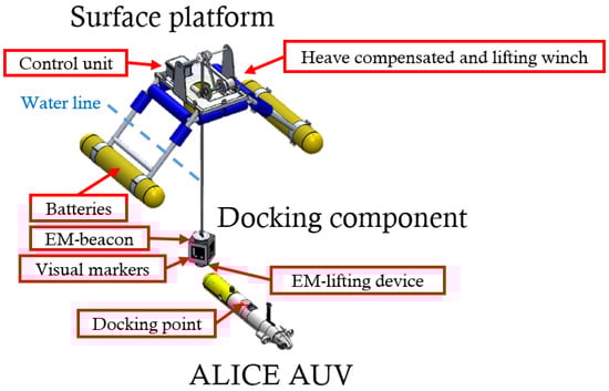 Autonomous underwater vehicles (AUVs) are unmanned and untethered robots capable of operating autonomously for extended periods without the need for manned supervision or surface support. These capabilities make them suitable for various tasks, including seabed survey and monitoring [1,2,3], inspection of offshore structures [4], mine countermeasures [5], and intervention [6]. Nevertheless, while untethered operation grants AUVs the freedom to cover extensive areas without the need for tether management, it also constrains their operational endurance to the capacity of onboard batteries, which becomes particularly critical during surface operations requiring continuous thrust to maintain position, as well as in data collection tasks, which are constrained to the opportunities for transferring the collected data.