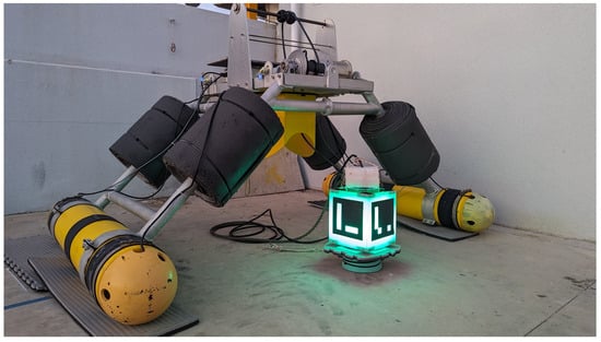 Specialized docking stations (DS), designed for underwater docking, have the potential to reduce the complexity and risks associated with surface L&R operations. Fixed on the seabed and located close to offshore infrastructure, subsurface DSs can support continuous operation without the need for periodic surface recovery [9]. This concept has been extensively studied, leading to the proposal of various designs. Directional docking within a protective frame or funnel [10,11,12,13,14,15] allows the protection of the AUV from the environment and eases the connection interface with the dock. However, this method requires the precise alignment between the AUV and the dock. This constraint may be challenging, particularly in scenarios where side currents cause the AUV to drift. To reduce the necessity for alignment, a concept of docking with a pole or wire was developed and is used mainly in automated launch and recovery systems (LARS) [16,17,18,19].