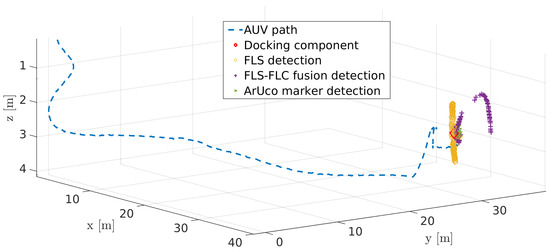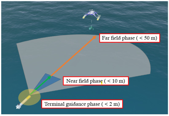 The detection and positioning of the DDS was performed by employing the on-board FLS, FLC, and magnetometers. To optimize detection accuracy, these sensors were utilized in three distinct phases of guidance, as illustrated in Figure 8. In the far-field phase, positioning was performed only by the FLS, which was expected to detect the DDS from a distance of circa 50 m. The FLS, however, is capable of providing only the horizontal position of the DDS and was unable to provide the depth of the docking component.