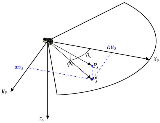 where and represent the focal lengths and , denote the offsets between the FLC’s optical center and the origin of the image’s pixel coordinates, as illustrated in Figure 13.