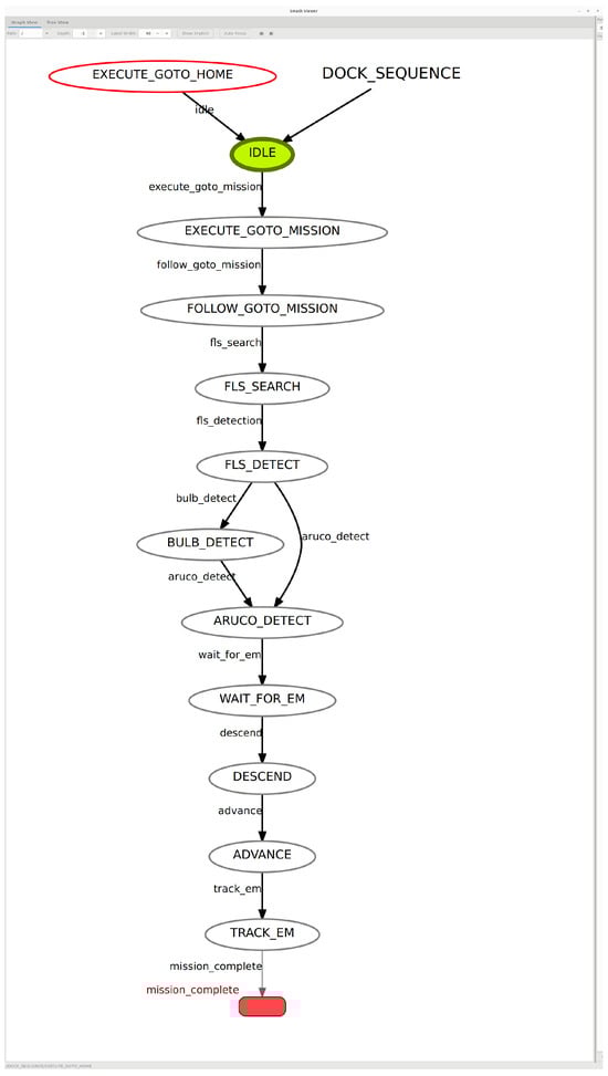 The docking sequence was implemented onboard the AUV using the ROS SMACH state machine library, designed for building hierarchical state machines. A simplified version of the docking sequence created with SMACH is shown in Figure 15. The docking sequence began with the “go-to” command (denoted EXECUTE_GOTO_MISSION in the SMACH framework), which provided a 3D goal point for the AUV. Simultaneously, the FLS detection node actively searched for the DDS. Upon detection by the FLS, the FLS-based guidance (FLS_DETECT) was activated. The transition from the far-field to the near-field phase occurred either upon detecting the illumination of the docking component (BULB_DETECT) or upon recognizing the markers (ARUCO_DETECT).