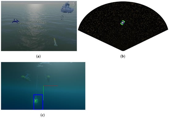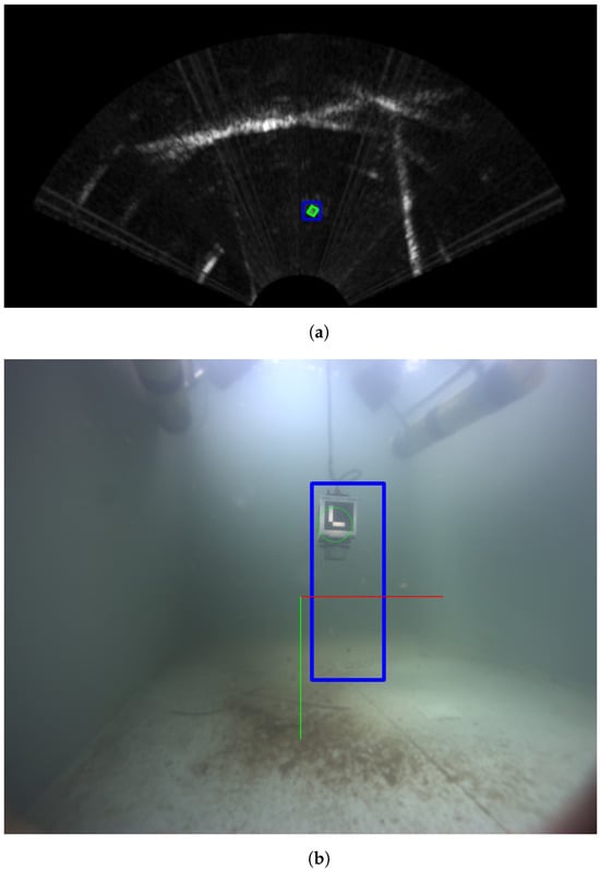 The vertical bounds of the ROI, represented by , were determined using Equation (6) and by incorporating physical constraints to determine . Considering that the FLS cannot detect objects located outside its field of view, denoted by , and above the sea surface, and taking into account that the docking component is deployed within the depth limits , the vertical bounds of the ROI were defined as follows: