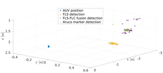 - The FLS-FLC fusion, tested primarily in pool experiments, demonstrated its ability to provide 3D positioning. The precision of the fusion was verified by comparing the 3D positions calculated by the fusion algorithm with those obtained using the ArUco marker pose estimation algorithm. As shown in Figure 20, the computed positions exhibited an accuracy of less than 10 cm in most cases, with deviations mainly caused by false detections of one or both sensors. It is worth noting that the accuracy of the ArUco algorithm had previously been validated by positioning ALICE at fixed distances from the markers and comparing the calculated distances with actual measurements.