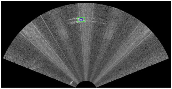 FLS data often consist of noise attributed to factors such as acoustic reverberations, signal scattering, variations in sensitivity between FLS transducers [32], interference originating from AUV’s electronics, and other acoustic sensors such as DVL [33]. Noises associated with varying transducer sensitivities result in artifacts at constant azimuth, as illustrated in Figure 10a. To eliminate these artifacts, the Hough line transform was applied to adaptively mask the noise that appears at constant azimuth. This process is illustrated in Figure 10b, where straight black lines at constant azimuths mask the artifacts (represented by gray lines) that exceed a certain threshold. Sparse electronic noise, characterized by momentary high-intensity artifacts, was suppressed by averaging every two consecutive frames (denoted and ) as follows:
