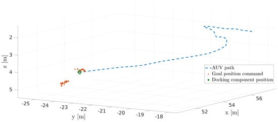 Subsequently, the AUV utilized EM-based guidance (TRACK_EM) to accurately position itself below the docking component while maintaining a consistent depth. Upon reaching the target position within a 15 cm tolerance, the final state (MISSION_COMPLETE) was activated. In this state, the vertical thruster was deactivated, allowing the AUV’s positive buoyancy to lift it gently until it securely attached to the lifting electromagnet. It is worth noting that at this stage of development, failed attempts were not handled automatically. Instead, manual intervention was required to return to the previous state, using the last known position of each state as a reference point.