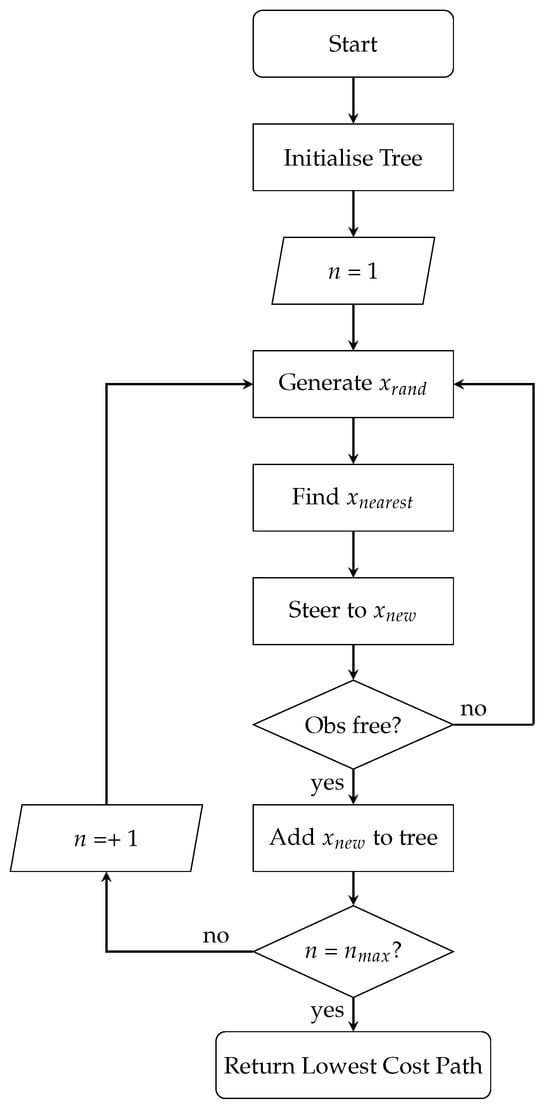 The first path planner considered within this study is a classical RRT algorithm [36]. As discussed above in Section 2.2, the RRT algorithm is a sampling-based path-planning method designed to efficiently explore high-dimensional spaces. This algorithm ensures rapid coverage of the search space but does not evaluate globally optimal paths. RRT incrementally builds a tree rooted at the start position by randomly sampling points in the configuration space and extending the nearest tree node toward each sampled point, subject to obstacle constraints. It is important to note that this algorithm traditionally considers the cost between nodes only in terms of distance. New nodes will be generated until the total number of nodes on the tree, n, is equal to the predefined maximum number of nodes, . The RRT algorithm searches the environment map following the process set out in Figure 2.