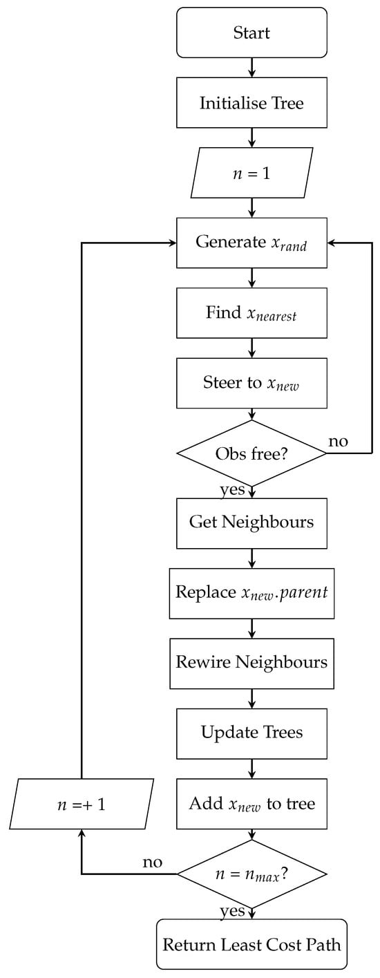 Karaman and Frazzoli introduced RRT*, an asymptotically optimal extension of RRT, i.e., as the number of nodes on the tree increases, the cost of the returned solution converges on an optimal value [37]. The RRT* algorithm detailed here has two key differences compared to RRT. First, the nearest neighbours of are found, to evaluate if any would make a more appropriate parent node. Second, the neighbours are evaluated in order to rewire the tree for lower cost connections as new nodes are generated. Figure 3 details this process, as implemented for this work, where cost is measured in terms of path length.