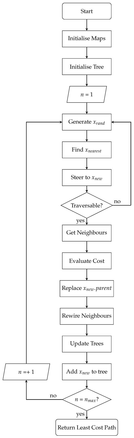 Originally developed by LaValle [36], the Rapidly Exploring Random Tree (RRT) algorithm provides a randomised data structure for solving motion-planning problems, particularly for non-holonomic vehicles. Its strengths include a strong bias toward unexplored regions, probabilistic completeness, and guaranteed connectivity of nodes. Building on this foundation, Karaman and Frazzoli proposed RRT*, which introduces asymptotic optimality, meaning that as the tree grows, the solution cost converges to the optimal value [37]. The RRT algorithm can be further extended to adjust the quality of the output to suit a given application. Two commonly extended features of RRT are growth biasing and path smoothing. The growth of an RRT can be heuristically biased to guide the tree towards a goal and/or away from high cost areas [38]. The latter case is particularly useful in mobile robotics applications, where the operational environment may contain many terrain types. Urmson and Simmons showed that, by introducing terrain heuristics, the quality of paths generated by an RRT in a variable cost space with obstacles can be significantly improved [38]. However, any artificial biases applied to the algorithm must be carefully considered. For example, a bias towards the goal that is too strong could result in a search which gets caught in local minima [36].