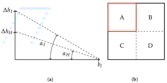 As previously highlighted, obtaining environmental data is a pre-requisite for this approach. In this study, high-resolution digital elevation maps (DEMs) from the Mars Reconnaissance Orbiter provide terrain information regarding the given mission site, from which slope angles are derived [49]. The terrain traversability analysis is performed for the given mission site to categorise regions as traversable, impassable, high risk, or unreachable. Traversable regions are deemed safe for exploration. Impassable terrain is defined by slope angles exceeding , while high risk terrain corresponds to slope angles exceeding . Terrain is classified as unreachable if it is isolated by surrounding impassable zones, assuming a nominal starting point at coordinate (0,0). Figure 5a shows the slope angle thresholds for high risk, , and impassable, , terrain categorisation, where the block length defined with in the map, in this case m for a mission site composed of a block grid. is the altitude difference required between two neighbouring blocks for the current block to be categorised as high risk and is the altitude difference required between two neighbouring blocks for the current block to be categorised as impassable. Figure 5b shows an example of comparison between neighbouring blocks. A is the first block to be checked, and it has three neighbours, B, C, and D. The value of between A and each of its neighbours is calculated. The worst case value is then used to categorise block A.