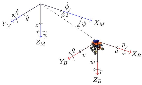 The body-fixed translational velocity components are denoted by u, v, and w, and the rotational velocities by p, q, and r. The rover’s rigid body dynamics, with reference to the body-fixed frame and Mars-fixed frame, can be described by the matrix relationships shown in Equations (3)–(5) [50].
