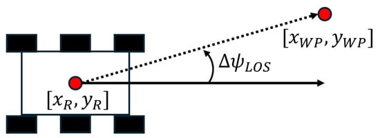 The required change in heading angle, , to reach the waypoint, , is evaluated using Equation (7).