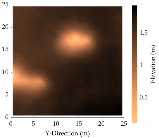 A mission site of 250 m × 250 m has been chosen in Jezero crater, Mars. Given that the rover’s scale is approximately th that of the Perseverance rover, the mission site is proportionally reduced to a size of 25 m × 25 m. The environment model is generated using a digital terrain map [53] from the HiRISE orbiter [54]. Figure 9 shows this mission site as modelled in MATLAB.