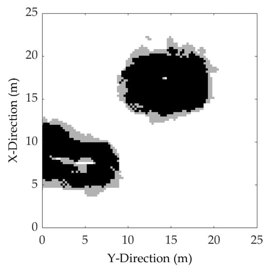 Mission site traversability map where traversable regions are shown in white, impassable regions are shown in black, high risk regions are shown in grey.