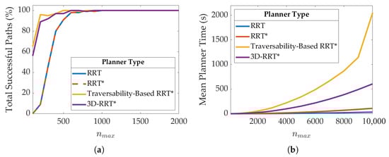 In Figure 11a, it can be seen that both RRT and RRT* perform relatively poorly at low values of . This is primarily because the trees initially explore the entire environment indiscriminately, which delays their progression towards the target point. Additionally, RRT and RRT* exhibit the same success rate. This is because the RRT* algorithm is exploring the full environment and is very unlikely to carry out rewiring so early on. As both algorithms are provided with the same random seed, these early paths are very similar. Both Traversability-Based RRT* and 3D-RRT* exhibit significantly higher success rates at low values of because the tree’s growth is biased towards the goal. All four planners exhibit 100% success rates at .