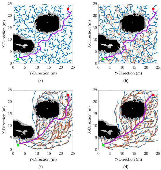 Representative examples of the selected RRT-based algorithms, with 1000. (a) RRT; (b) RRT*; (c) Traversability-Based RRT*; (d) 3D-RRT*.