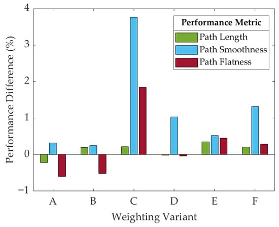 Figure 13 shows the impact of varying the cost function weights on path quality over a set of 100 tests, where in each case the random seed is set with relation to the test index.