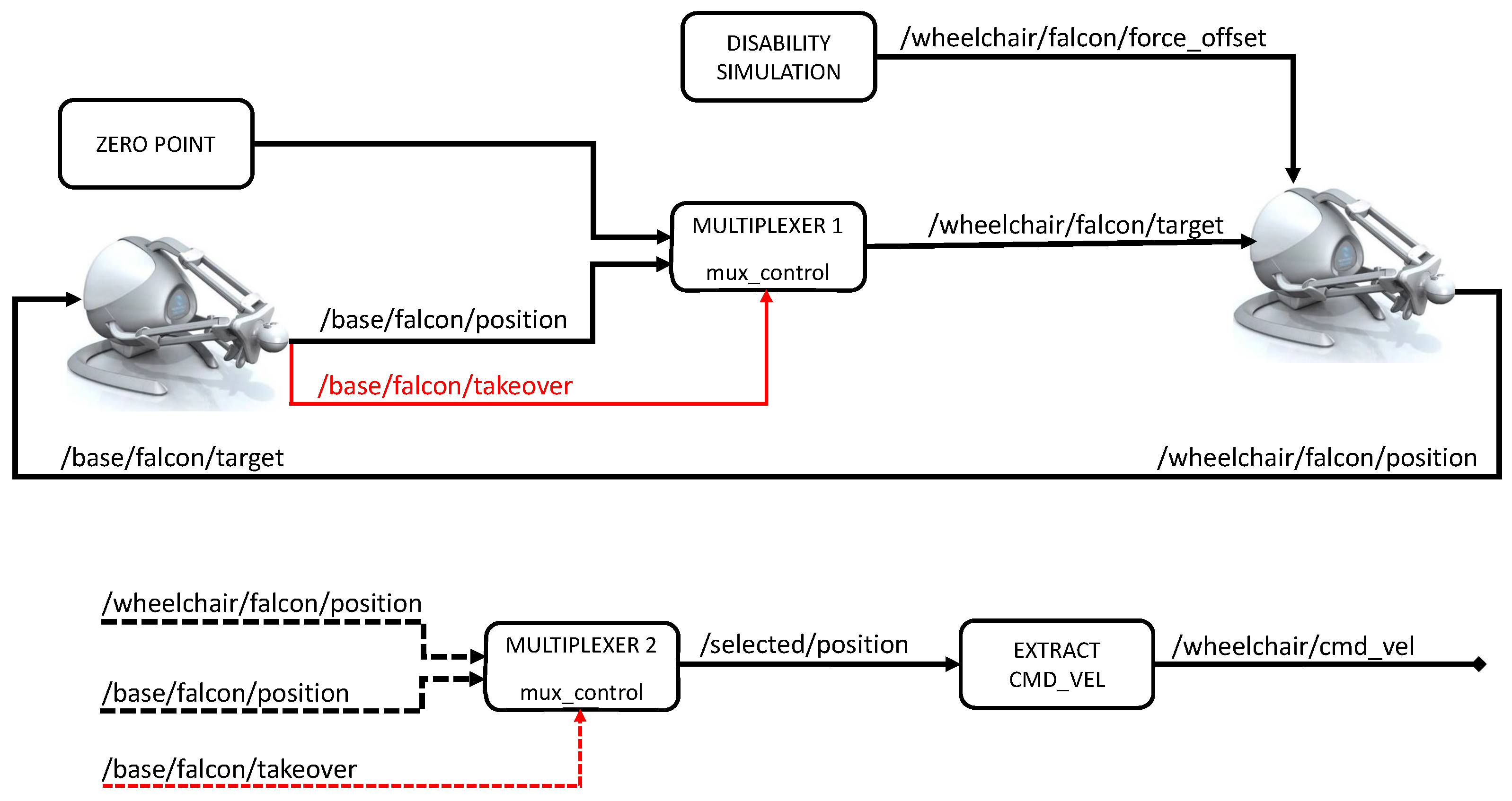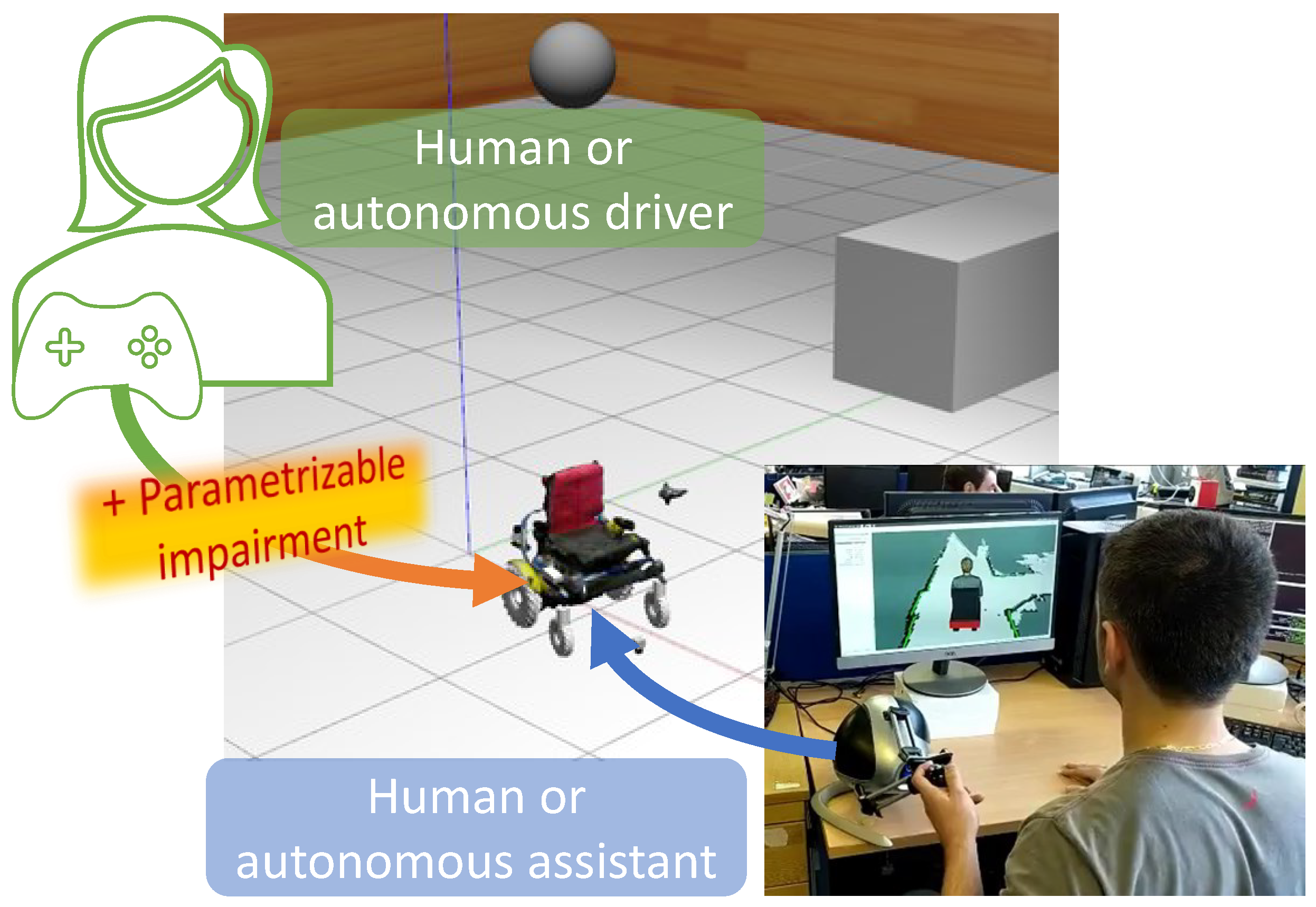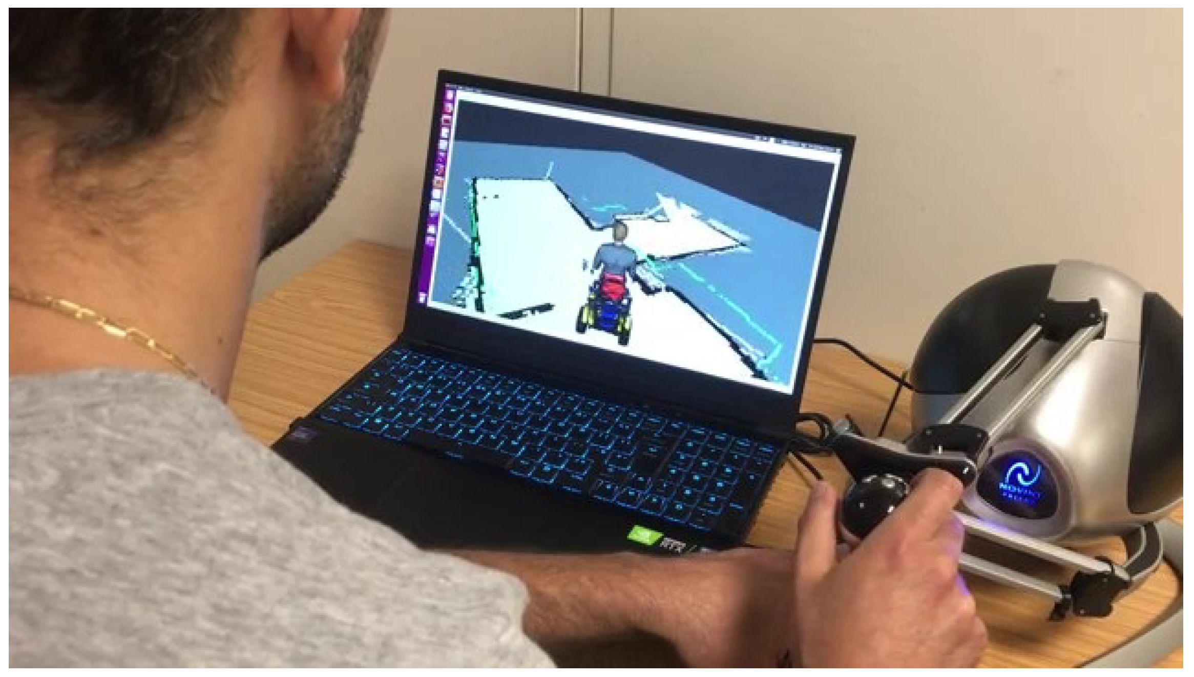 - Devigne, L.; Babel, M.; Nouviale, F.; Narayanan, V.K.; Pasteau, F.; Gallien, P. Design of an immersive simulator for assisted power wheelchair driving. In Proceedings of the IEEE International Conference on Rehabilitation Robotics, London, UK, 17–20 July 2017; pp. 995–1000. [Google Scholar] [CrossRef]