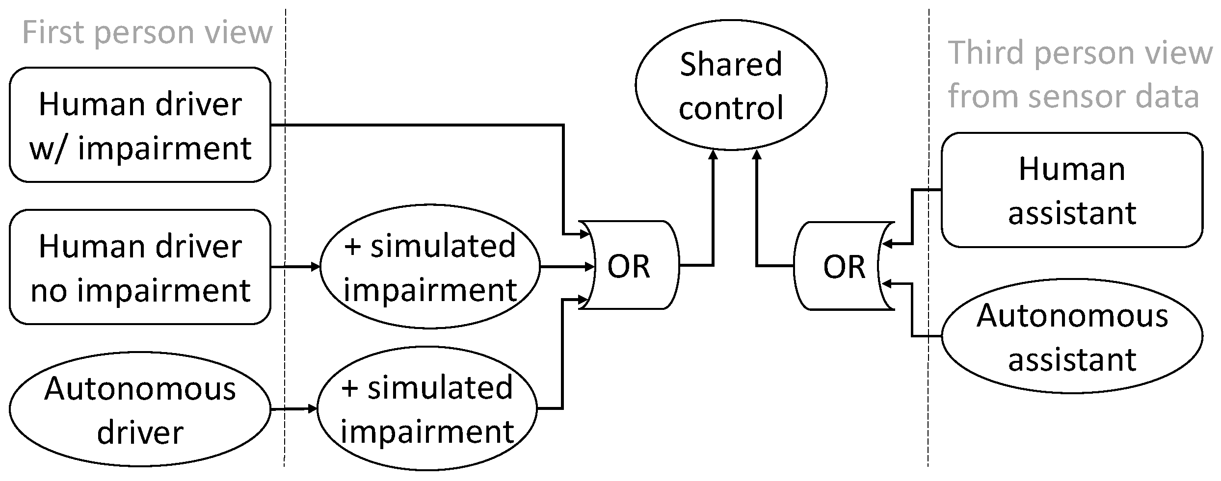 - Teodorescu, C.S.; Carlson, T. AssistMe: Using policy iteration to improve shared control of a non-holonomic vehicle. In Proceedings of the 2022 IEEE International Conference on Systems, Man, and Cybernetics (SMC), Prague, Czech Republic, 9–12 October 2022; pp. 941–948. [Google Scholar] [CrossRef]
