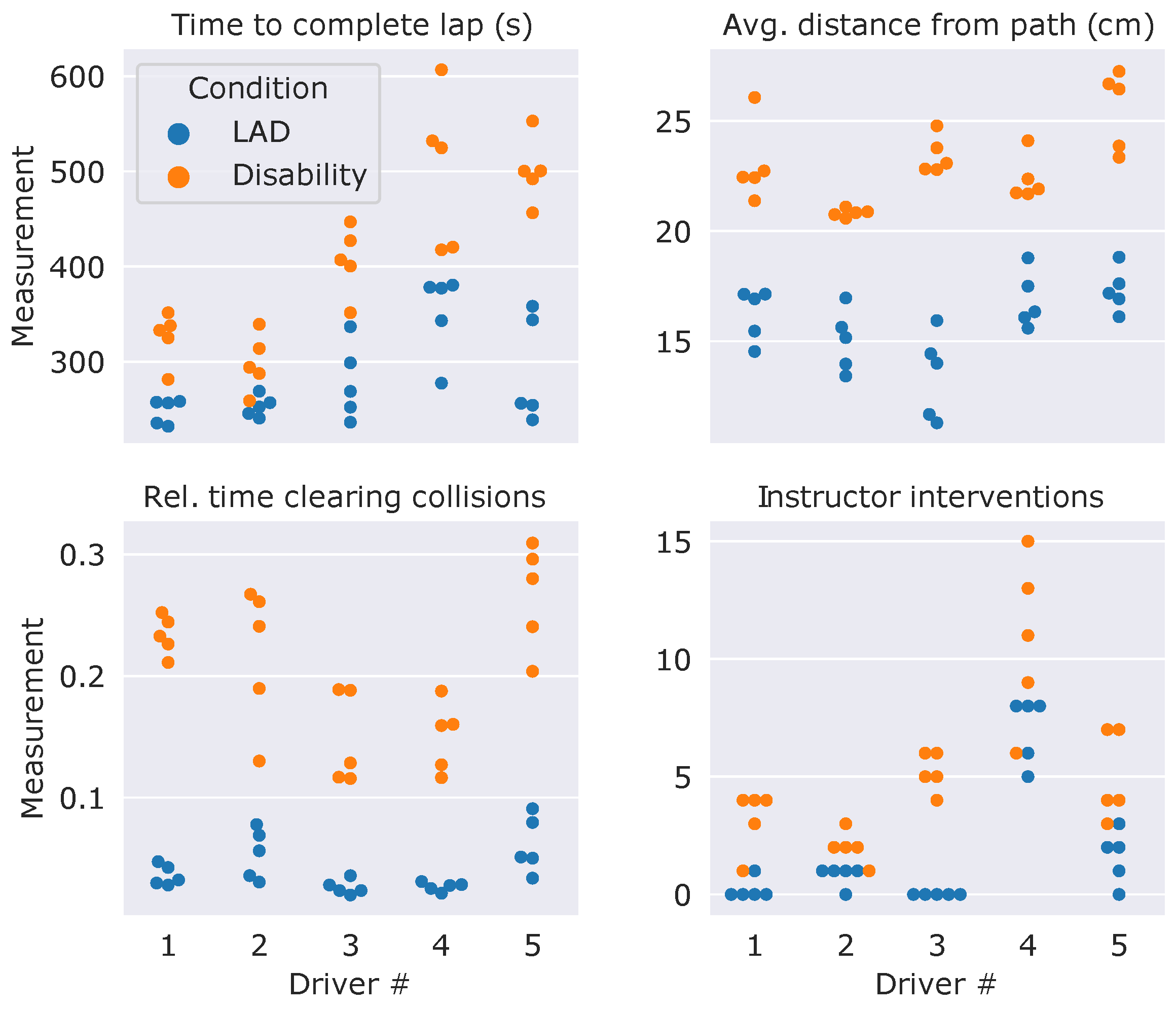 - Fraction of time spent clearing collisions: the ratio of time spent in autonomous collision recovery behaviour to the total lap time;