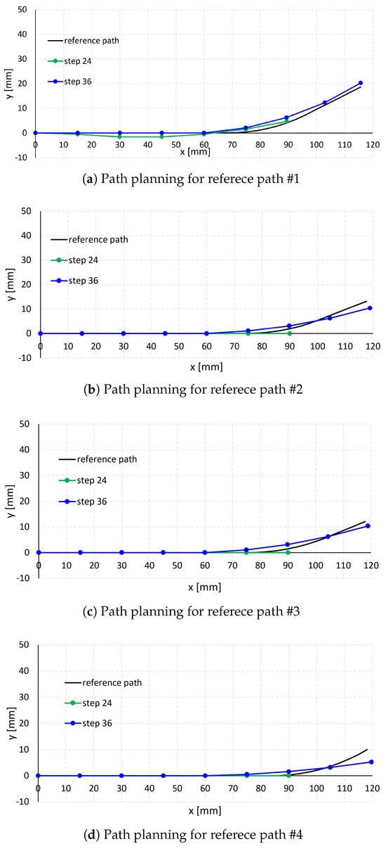 - Path planning experiments using three reference passages with experimentally induced kinematics, demonstrating the robot’s reference path-following capability.