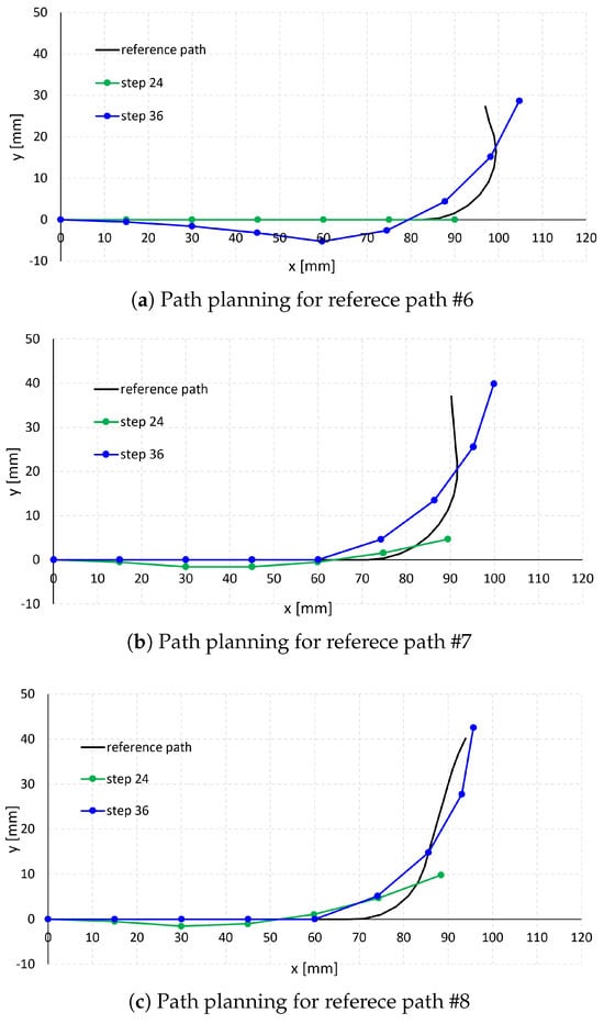 In each subfigure of Figure 7 and Figure 8, the black curve represents the reference passage, while the green and blue curves represent the path planning results at steps 24 and 36 (step 28 for case #10 in Figure 6j), respectively. Steps 24, 28, and 36 correspond to robot insertion lengths of 90 mm, 105 mm, and 135 mm, respectively, calculated as 3.75 mm × step number. The dots along the green and blue curves indicate the positions of the unit endpoints.