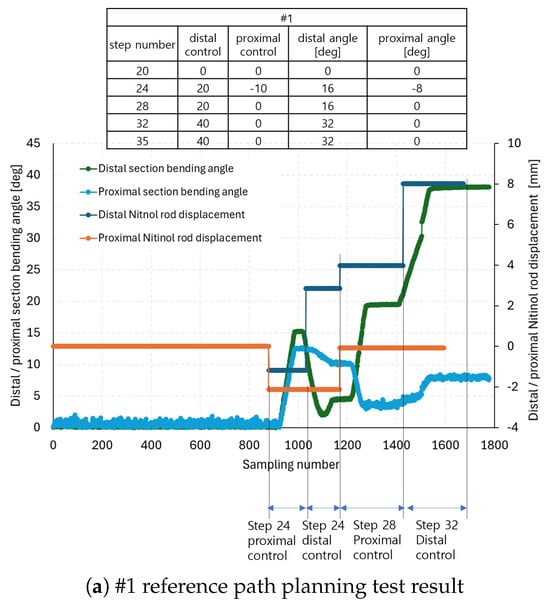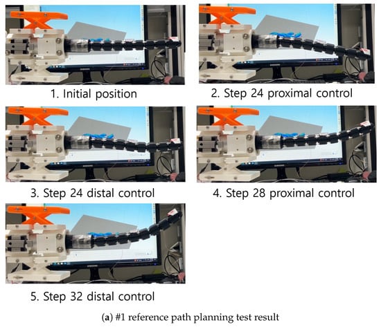 In Table 5 and the paragraph above, the symbol (–) indicates downward bending, attached to positive absolute angle measurements in Figure 9a–c. The absolute differences between the expected and measured distal and proximal angles were then computed. On average, differences of 5.6 degrees for the distal section and 4.1 degrees for the proximal section were achieved. Figure 10a–c shows snapshots of the reference path-following test at the end of each control step, corresponding to the arrows in Figure 9a–c. These subfigures can also be compared directly with the simulation results in Figure 7a–c and Figure 8e.