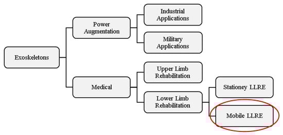 Lower limb rehabilitation exoskeletons (LLREs) can serve a wide range of patients suffering from spinal cord injury, stroke, cerebral palsy, Parkinson, multiple sclerosis, and traumatic brain injury. Rehabilitation robots, such as LLREs, can assist therapists in reducing their workload, analyzing training data, and evaluating recovery in a controlled and reproducible manner []. The exoskeletons have been designed and studied since the 1960s, but technical limitations prevented them from achieving their intended objectives. Functional classification of exoskeletons based on their applications related to rehabilitation of the lower limb is shown in Figure 1. Within the medical domain, exoskeletons are designed for upper limb and lower limb rehabilitation. LLREs are further categorized based on their usage in two primary settings: stationary and mobile. Stationary exoskeletons refer to exoskeletons integrated into fixed platforms combined with treadmill and body weight support systems whereas mobile exoskeletons refer to rehabilitation systems which provide on-ground training either independently or with mobile platforms. This research focuses on the modeling and simulation of mobile LLREs. The category of mobile exoskeletons is highlighted in Figure 1 to emphasize the scope of the present work.