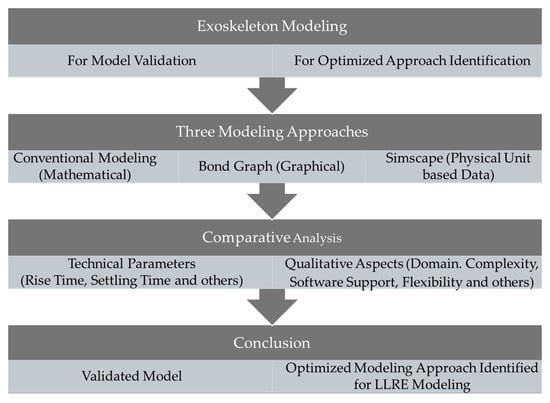 Several modeling approaches, i.e., analytical, graphical, and physical, have been reviewed above. Despite significant achievements in the modeling of exoskeleton systems, previous studies primarily focused on individual modeling and lacked a structured and comprehensive comparison of modeling approaches. Such a comparison is essential in the identification of the most suitable modeling approach for LLRE. Consequently, it remains an open research challenge to select the most suitable modeling approach for multidomain systems that ensure accuracy, ease of use, and computational efficiency. Firstly, this work addresses the highlighted gap by providing a systematic and structured comparison of modeling approaches based on technical parameters, thereby validating the existing models. Secondly, through the comparison of qualitative aspects, this work contributes the identification of the optimized approach for the modeling of the LLRE. Together, these contributions reflect the novelty of this research work. The research methodology followed in this work is presented in Figure 2.