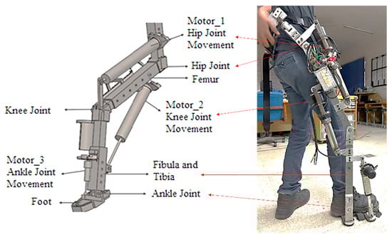 The proposed LLRE has three DOF and consists of three links, where link 1 is aligned to the femur, link 2 with the fibula and tibia and link 3 with the foot. The hip, knee, and ankle joints are designed for flexion and extension. The maximum range of motion for the joints has been set at 30°/212° for the hip, 60°/210° for the knee, and 13°/220° for the ankle to ensure physiological comfort and safety. These joint angles belong to a local coordinate system of exoskeleton with neutral alignment set at 180°. Upon transforming these angles into clinical joint space, the ranges correspond to anatomical limits as established in [,] for hip, knee, and ankle joints. The exoskeleton system has 1 DOF movement for each joint (hip, knee, and ankle) with linear actuators. The CAD model and hardware of LLRE are shown in Figure 3.