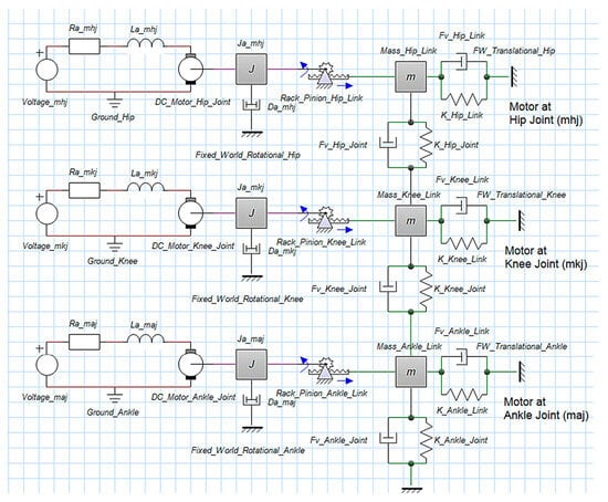 The composite model for hip joint control is considered. The schematic diagrams of the complete LLRE model and composite model are shown in Figure 4 and Figure 5, respectively. Figure 4 shows the schematic diagram of the LLRE. Three motors (mhj, mkj, and maj, i.e., motors for actuation of hip joint, knee joint, and ankle joint, respectively) along with rack and pinion mechanisms for achieving linear actuation are connected in parallel to the links which are connected using hinge joints. The damping and stiffness of the hinge joints are added in the model. Figure 5 shows the schematic diagram of the composite model presenting the linear actuator for hip joint actuation along with the rack and pinion and combined mass, damping, and stiffness from the distal links and motors as seen by the mhj. For the dynamic modeling of exoskeleton, two cases, i.e., exoskeletons with different values of system variables have been considered. The purpose of presenting two cases is to evaluate the dynamic behavior and robustness for different load conditions. The parameters for both cases are shown in Table 2.