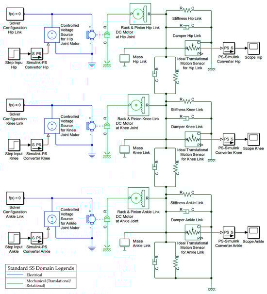 In this section, LLRE is modeled using Simscape. Multidomain components with physical signals are attached as per the schematic diagram and the system model is obtained. The controlled voltage source supplies the input voltage to the DC motor component which, according to the parametric values ( and ), converts the electrical energy to mechanical energy. The SS rack and pinion block converts the rotational motion to translational motion. The block named, “Simulink-PS Converter” converts the unitless numerical Simulink signal to a unit-based physical signal. Hence, bridging the gap between mathematical simulation and real hardware. The SS model of the complete LLRE is shown in Figure 9. The parametric values are obtained from Table 2, which were used for conventional mathematical modeling and bond graph modeling earlier. The equivalent composite model of the exoskeleton developed using SS is presented in Figure 10.