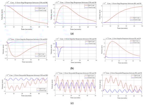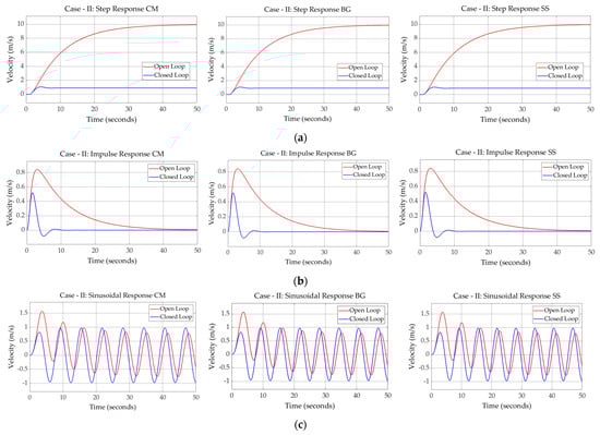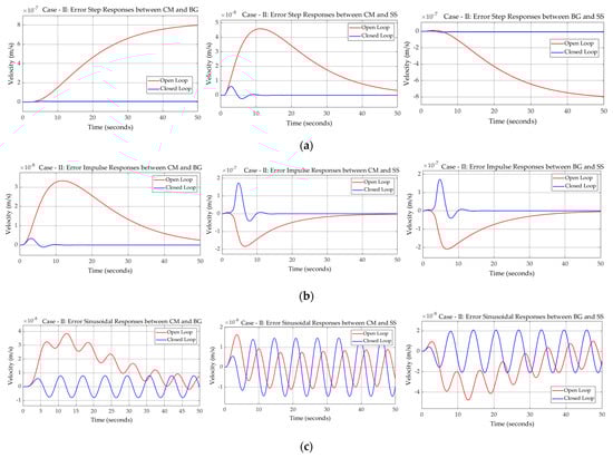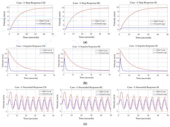 In this section, the dynamic responses of both cases of the LLRE obtained from CM, BG, and SS modeling approaches are presented and analyzed. Thereafter, the error between the responses obtained from CM and BG is compared with the SS modeling approach. This comparison will identify the differences between the models and, hence, will validate the existing model. Figure 11 and Figure 12 show the OL and CL step, impulse, and sinusoidal responses of the LLRE case-I and case-II. For CL, the feedback configuration employed is unity. No additional scaling or controller design is introduced at this stage as the objective is to compare the responses from different modeling approaches for validation. The comparison of OL and CL step, impulse, and sinusoidal (time-varying signal) responses will highlight the tracking performance, response to sudden disturbances, and phase lag, respectively, in models with and without feedback. The reason for analyzing the system dynamics for these signals is because they represent typical scenarios in rehabilitation robotics and efficient control design.