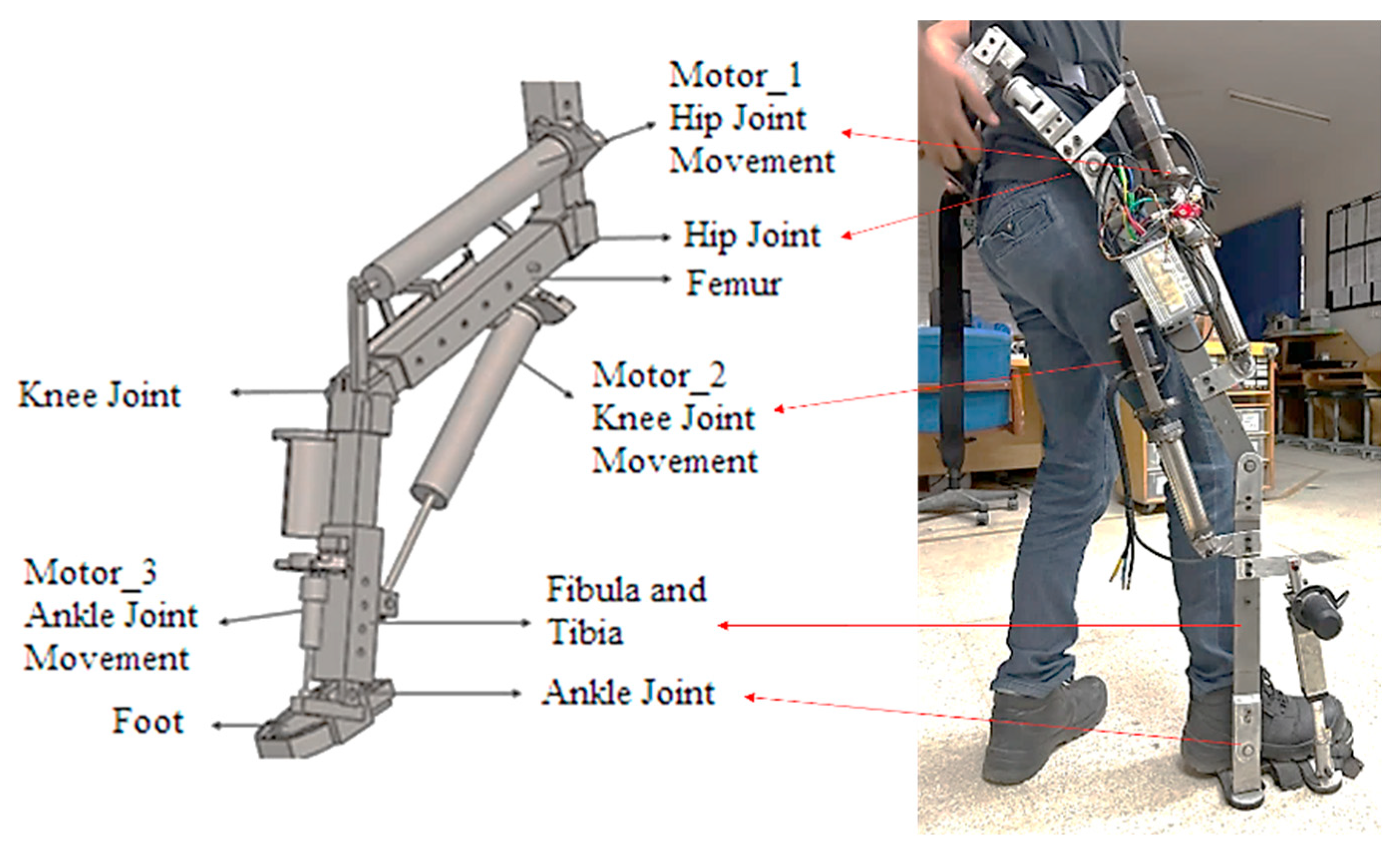 - Pirjade, Y.M.; Londhe, D.R.; Patwardhan, N.M.; Kotkar, A.U.; Shelke, T.P.; Ohol, S.S. Design and Fabrication of a Low-cost Human Body Lower Limb Exoskeleton. In Proceedings of the 6th International Conference on Mechatronics and Robotics Engineering (ICMRE), Barcelona, Spain, 12–15 February 2020; pp. 32–37. [Google Scholar] [CrossRef]