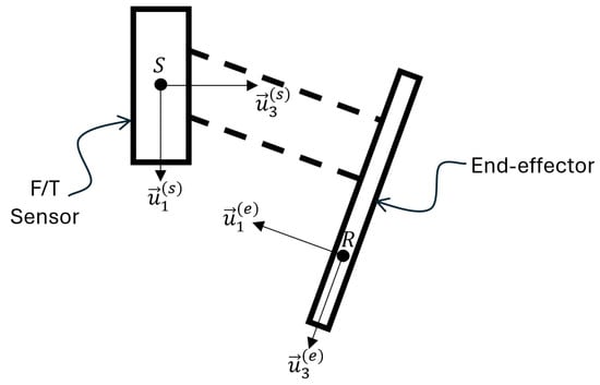 The admittance control of robots has been studied extensively [17,18,19]. The formulation provided in this paper differs from the previous admittance control studies since the calculations are carried out at the RCM. It is not possible to place a force/torque sensor at the RCM. Therefore, the interaction forcing measured at another location on the manipulator through a force/torque sensor is used for calculating the interaction forcing imposed at the RCM. Here, the subscripts S and R indicate the sensor’s center point and the RCM point, respectively. Superscripts s and e indicate the sensor measurement frame and the end-effector frame, respectively. The distance vector between the center of the sensor frame and the RCM point is defined by the vector . Figure 1 depicts these vectors and frames, and the dashed lines indicate a rigid connection between the force/torque sensor and the end-effector.
