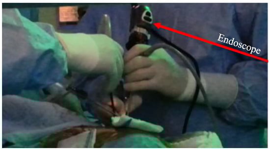 The case study selected to verify the formulation of the hybrid control algorithm is a surgical robotic scenario. This section describes the task in which the proposed control framework is integrated to demonstrate its applicability with the help of a commercially available collaborative robot. The surgical robotic scenario is an endonasal operation in which endoscopic pituitary tumor surgery is carried out. In these operations, the surgical instrument called the endoscope is inserted through the patient’s nostril to visualize the sella turcica (surgery area), which is the skull area, and the place of the pituitary gland. The primary challenge surgeons face in such surgeries is that while one hand adjusts the position of the endoscope, the other hand can only hold one instrument. This constraint limits the movement capability of the surgeon. Furthermore, controlling the endoscope for 2–4 h (average duration of the surgery) may lead to fatigue, and eventually, this mitigates the efficiency of the operation. To tackle this challenge, assistants take the workload from the surgeon by holding the endoscope as a third hand (see Figure 3), allowing him/her to use both hands actively [23]. An alternative solution to this problem is to integrate a robot that holds and directs the endoscope based on the demands of the surgeon. The motion demand of the surgeon can be extracted by various ways, including speech recognition, joysticks, or image processing algorithms. The motion can be triggered with the help of a foot pedal and hence, the surgeon is able to perform the operation with both hands while supervising the robot. This is a surgeon–robot coexistence scenario.