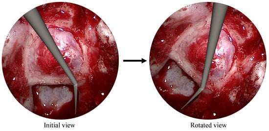Throughout these surgeries, the surgeon performs RCM about the aforementioned pivot point by rotating the endoscope about three axes that are roll, pitch, yaw angles, and translation along the insertion direction to reach the pituitary gland or remove the endoscope after the operation. The roll angle, which is the rotation about the endoscope’s telescope axis, is necessary to maintain the surgical area view displayed on the monitor in the same orientation as presented in Figure 4.
