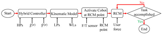 The block diagram representation of this algorithm can be developed based on a hybrid position/force control scheme [22] using a diagonal selection matrix . This selection matrix enables defining the constrained motion directions and those in which the human operator’s forcings can dictate the motion. Figure 2 shows the block diagram of the hybrid position/force control scheme for implementing admittance control about the RCM.