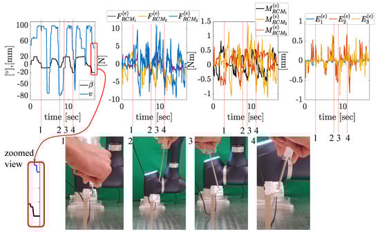 Experiment-E results where and v combine movement is conducted. Red dashed lines with the 1, 2, 3, 4 numbers denote the state of the experiments, and pictures show the configuration of the robot at that instant of time. /v is /100 mm in state-1, −/−78 mm in state-2, /−8 mm in state-3, and −/36 mm in state-4. and represent the force and torque values resolved at the RCM point. where denotes the Cartesian position error at the RCM point along , , and , respectively.