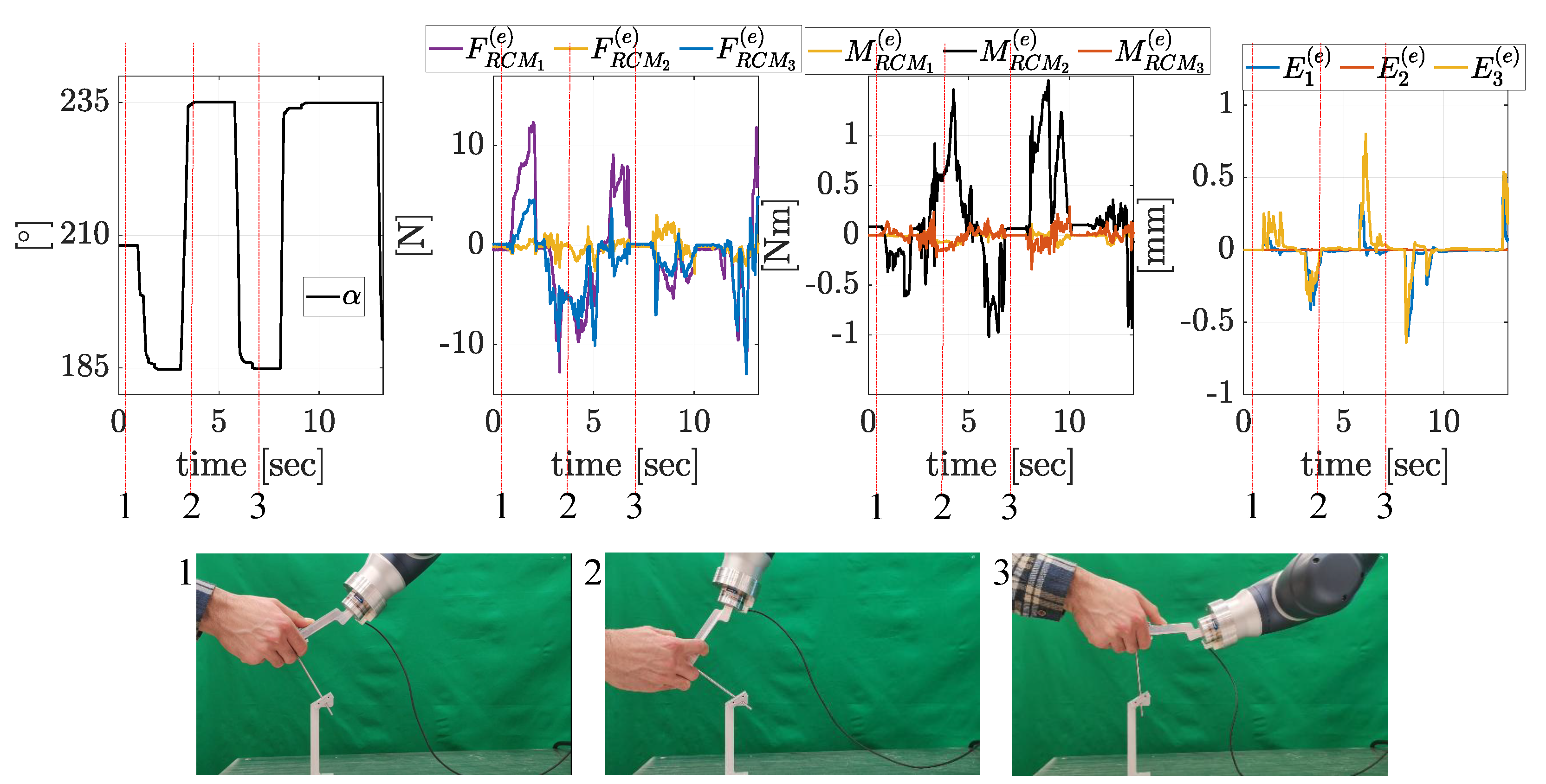 Verification of the designed control framework through a robot arm driven by a user under different admittance terms assigned for different RCM axes to perform combined (e.g., yaw and translation) and separate movements (e.g., only translation).