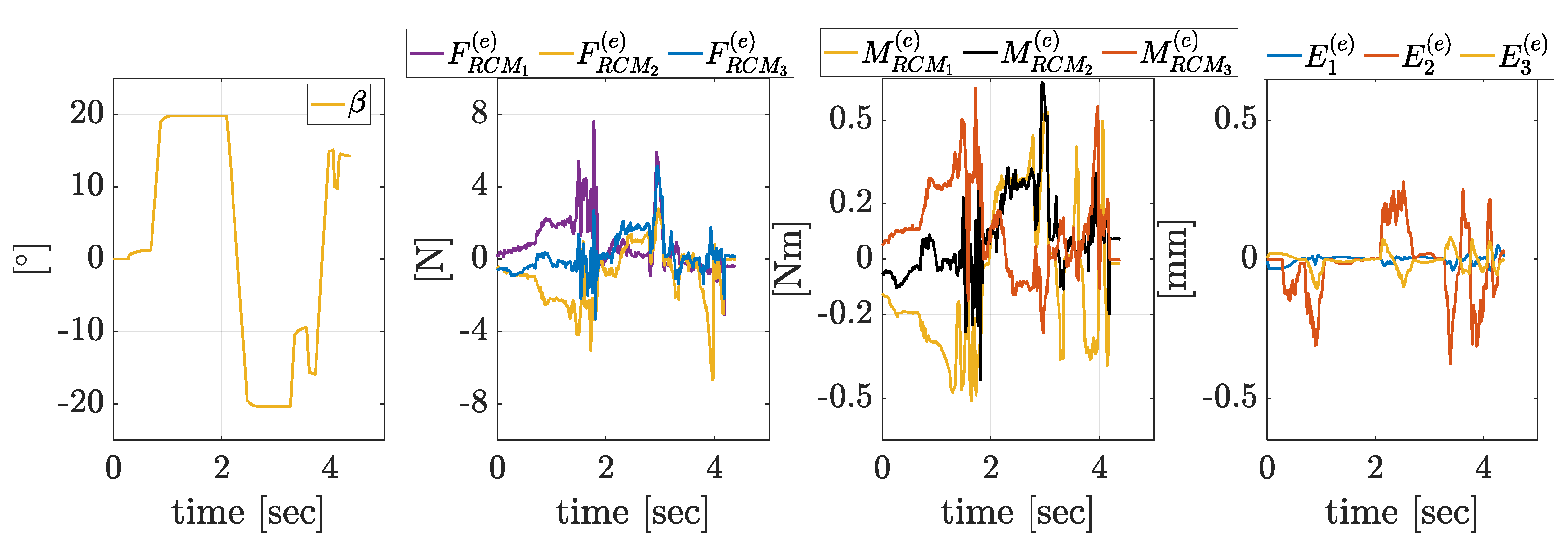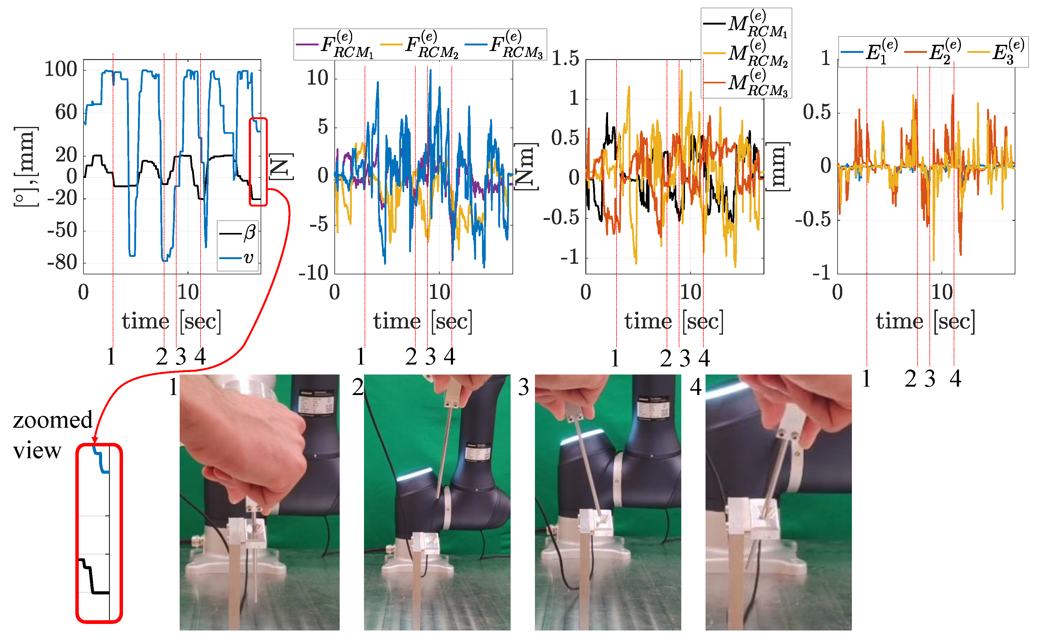 Furthermore, the current large step size also limits the speed of the operation. The surgeon needs to put more effort in moving the endoscope with a large step size since admittance gains should be limited due to safety reasons. On the other hand, higher admittance gains can be assigned when a smaller sampling size is set (i.e., sampling frequency must be higher), and eventually faster motions can be carried out under the same effort of the surgeon. Also, the calculation of the force–torque vector at the end-effector assumes that the RCM point is always maintained perfectly. However, due to the beforementioned sampling time issues, in the current experimental setup, there is a small deviation from the RCM point. Therefore, with an industrial setup that has higher sampling frequency capacity, more dynamic motions of the endoscope can be achieved with the small effort of the surgeon, and force–torque calculation errors can be made smaller, even negligible. It should be noted that this limitation in the implementation is not imposed by the proposed formulation.
