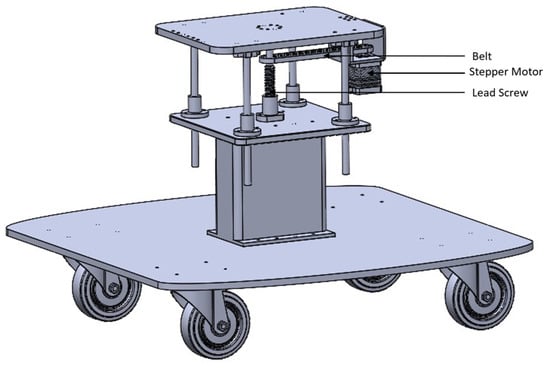 The foundation of the lower extremity exoskeleton system is a robust mobile platform designed to provide stability, ease of transport, and vertical adjustability for alignment with users of varying anthropometric dimensions. The platform consists of two structural levels: a lower steel base plate equipped with caster wheels, and an upper adjustable plate that serves as the mounting interface for the leg mechanism. The lower base plate is fabricated from steel to ensure a low center of gravity and to withstand the reaction forces generated during rehabilitation exercises. It is supported by four caster wheels, enabling mobility and ease of repositioning in clinical environments. A vertical steel column is rigidly fixed to the lower base plate and extends upward to support the actuation and linkage assembly. At the top of this column, an upper platform is mounted using four linear guide shafts with linear bearings, allowing vertical translation while maintaining horizontal stability. The vertical motion of the upper plate is achieved using a lead screw mechanism, centrally aligned and driven by a stepper motor. A belt and pulley transmission system are employed between the stepper motor and the lead screw. This arrangement allows compact placement of the motor and offers smoother engagement and mechanical protection. This configuration allows precise height adjustment of the exoskeleton’s joint modules to match the user’s hip height, ensuring proper anatomical alignment. The stepper motor provides fine control over positioning, and the lead screw converts rotary motion into backlash-minimized linear displacement. Guide rods provide additional structural stiffness and vibration damping during adjustment. Figure 4 presents the structural design of the exoskeleton robot base, which supports the lower limb modules and actuation system.
