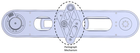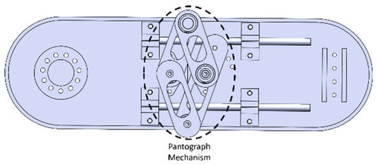 The hip flexion/extension (F/E) mechanism is responsible for replicating sagittal plane motion of the human hip joint, enabling forward and backward leg. This actuation module is mounted on the vertically adjustable top plate of the support structure and forms the proximal interface between the exoskeleton and the user’s thigh segment. A brushless DC motor is used to drive the hip F/E movement. The motor is securely mounted on a vertical bracket and delivers rotational torque directly to the thigh linkage. The mechanical layout ensures alignment of the motor’s axis of rotation with the anatomical hip joint to avoid kinematic mismatch and reduce unintended joint loading during therapy. A key feature of this mechanism is the integration of a pantograph-type length adjustment system along the thigh link. This mechanism is designed to accommodate users with varying femur lengths without requiring reconstruction of the link. The pantograph consists of two parallel rigid arms connected by a central linkage, which preserves the rotational symmetry and geometry of the leg while allowing for length variability. Each pivot point of the pantograph is supported by high-precision bearings to ensure smooth transmission. The pantograph structure is mounted on two linear guide rods which provide translational guidance during length adjustment. The bottom plate beneath the pantograph includes a series of pre-drilled mounting holes, enabling the clinician to lock the pantograph at discrete positions based on the user’s thigh length. Once the desired length is achieved, the mechanism is fastened using screws through the designated holes, ensuring structural rigidity and motion fidelity. The dual-plate configuration with rigid anchoring, combined with the pantograph adjustability, offers both mechanical robustness and user-specific rehabilitation. Figure 5 and Figure 6 present the detailed design of the hip flexion/extension mechanism integrated into the exoskeleton robot.